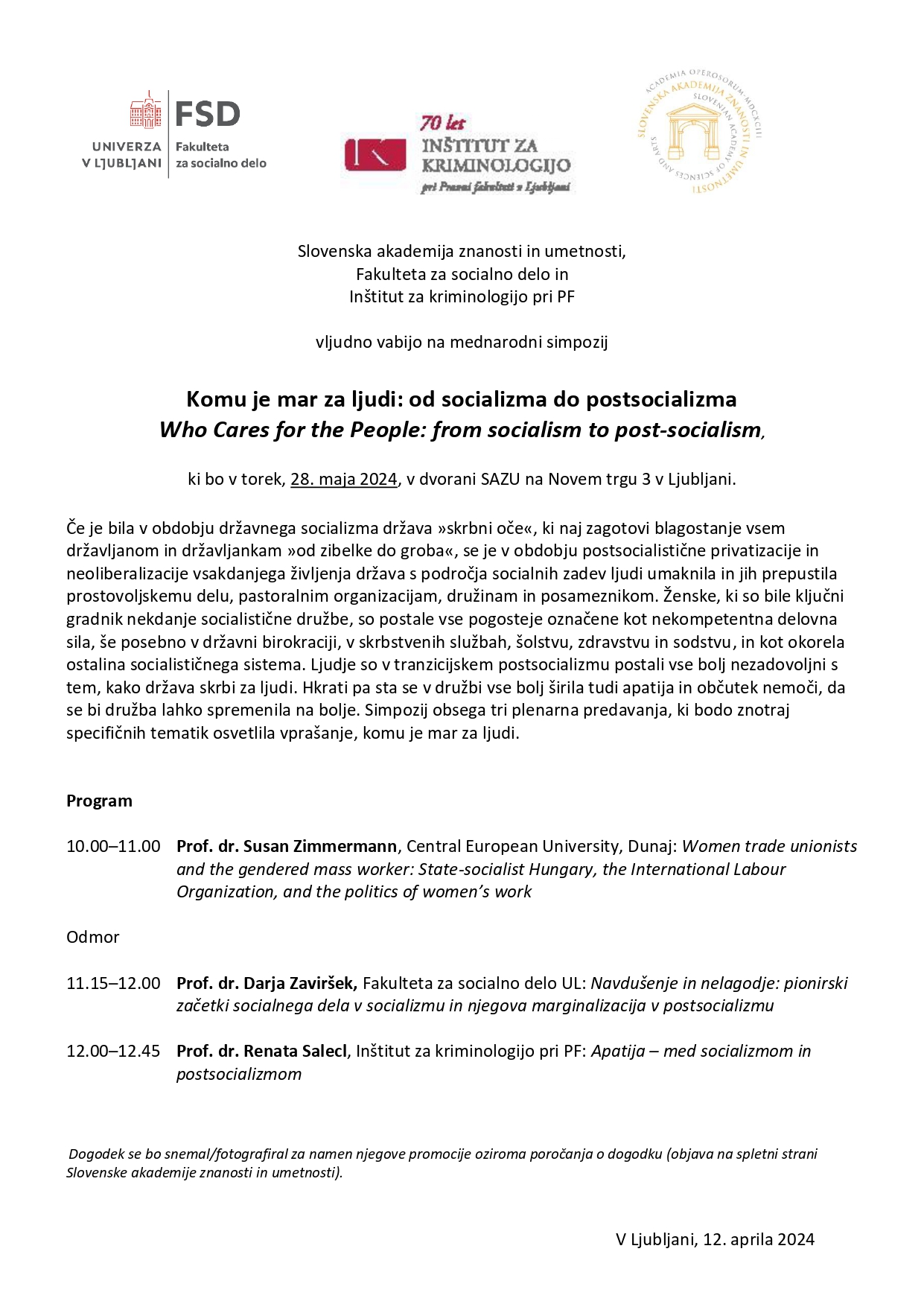 The Institute of Criminology at the Faculty of Law in Ljubljana co-organises an international symposium entitled Who Cares for the People: from socialism to post-socialism. The symposium will take place on 28 May 2024 at the SAZU Hall, Novi trg 3, Ljubljana, starting at 10.00. Dr Renata Salecl, researcher at the Institute of Criminology, will also participate. She will give a lecture entitled Apatija – med socializmom in postsocializmom. The event will be organised in cooperation with the Faculty of Social Work and the Slovenian Academy of Sciences and Arts.