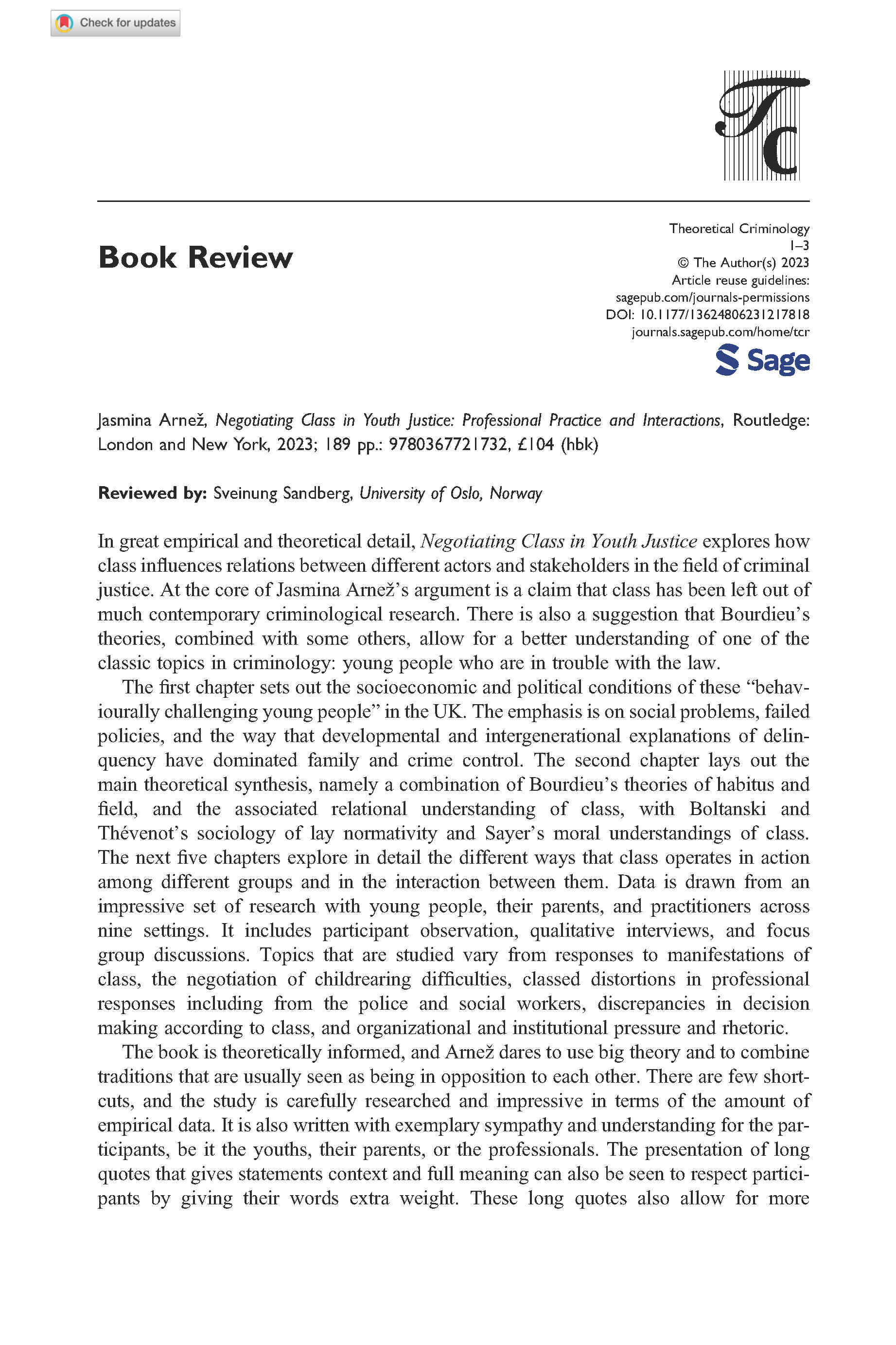 Professor Sveinung Sandberg from the University of Oslo has written a review of the book Negotiating Class in Youth Justice by our researcher Jasmina Arnež for the journal Theoretical Criminology. Jasmina’s book also won the British Society of Criminology’s 2023 Book Prize, awarded annually for first sole-authored books in the field of criminology.