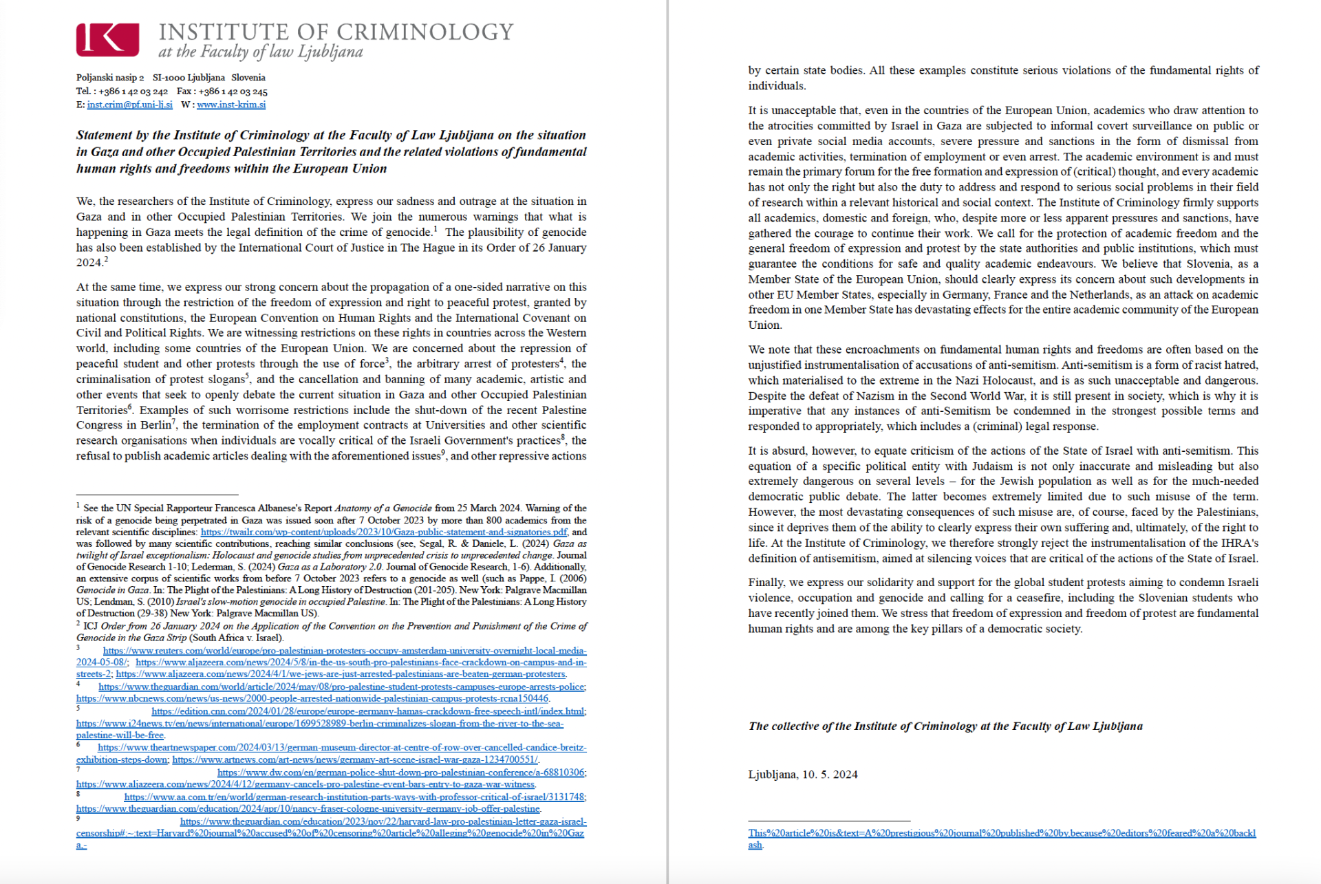 The statement of the collective of the Institute of Criminology at the Faculty of Law in Ljubljana is available here.