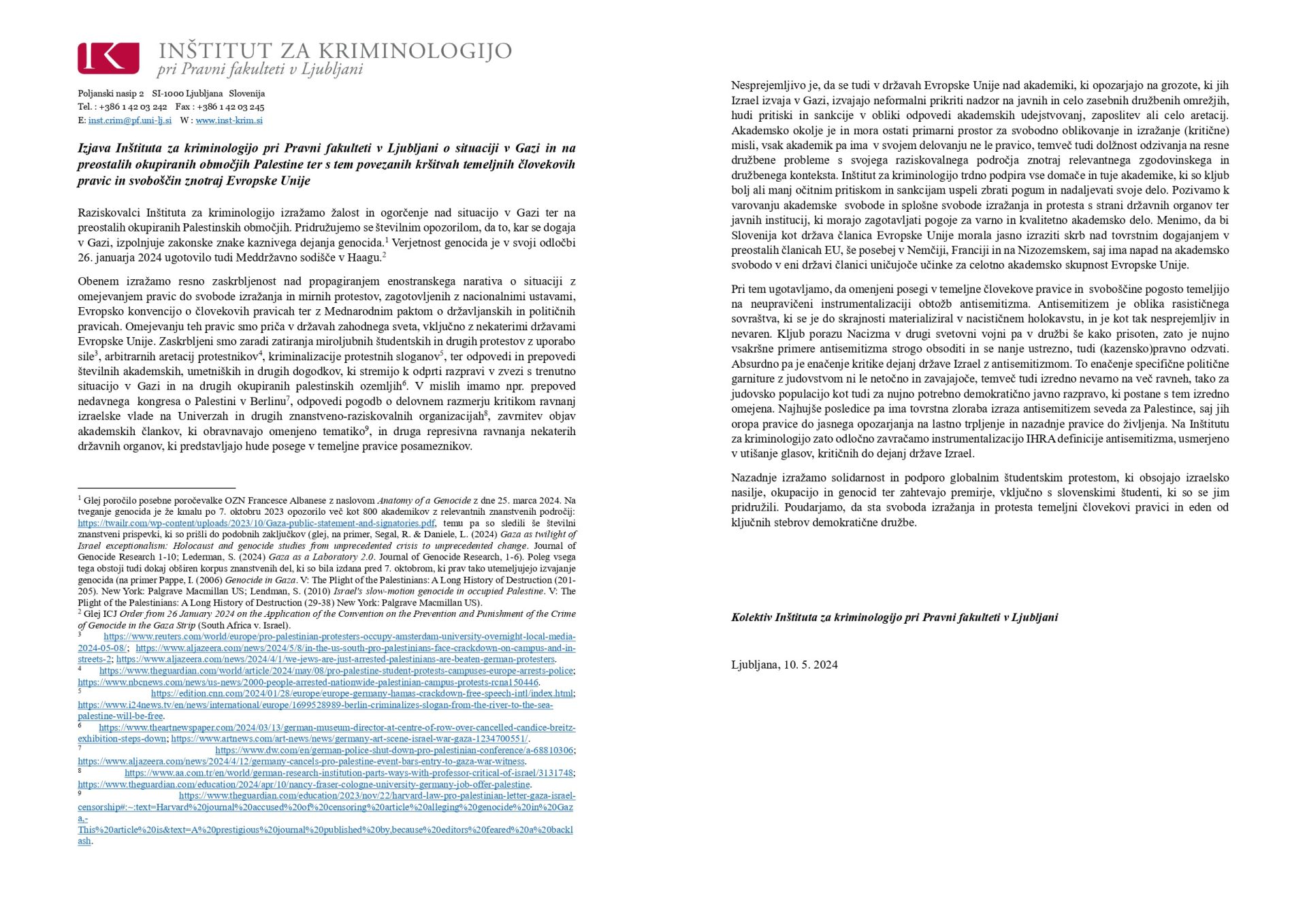 Izjava kolektiva Inštituta za kriminologijo pri Pravni fakulteti v Ljubljani je dostopna tukaj