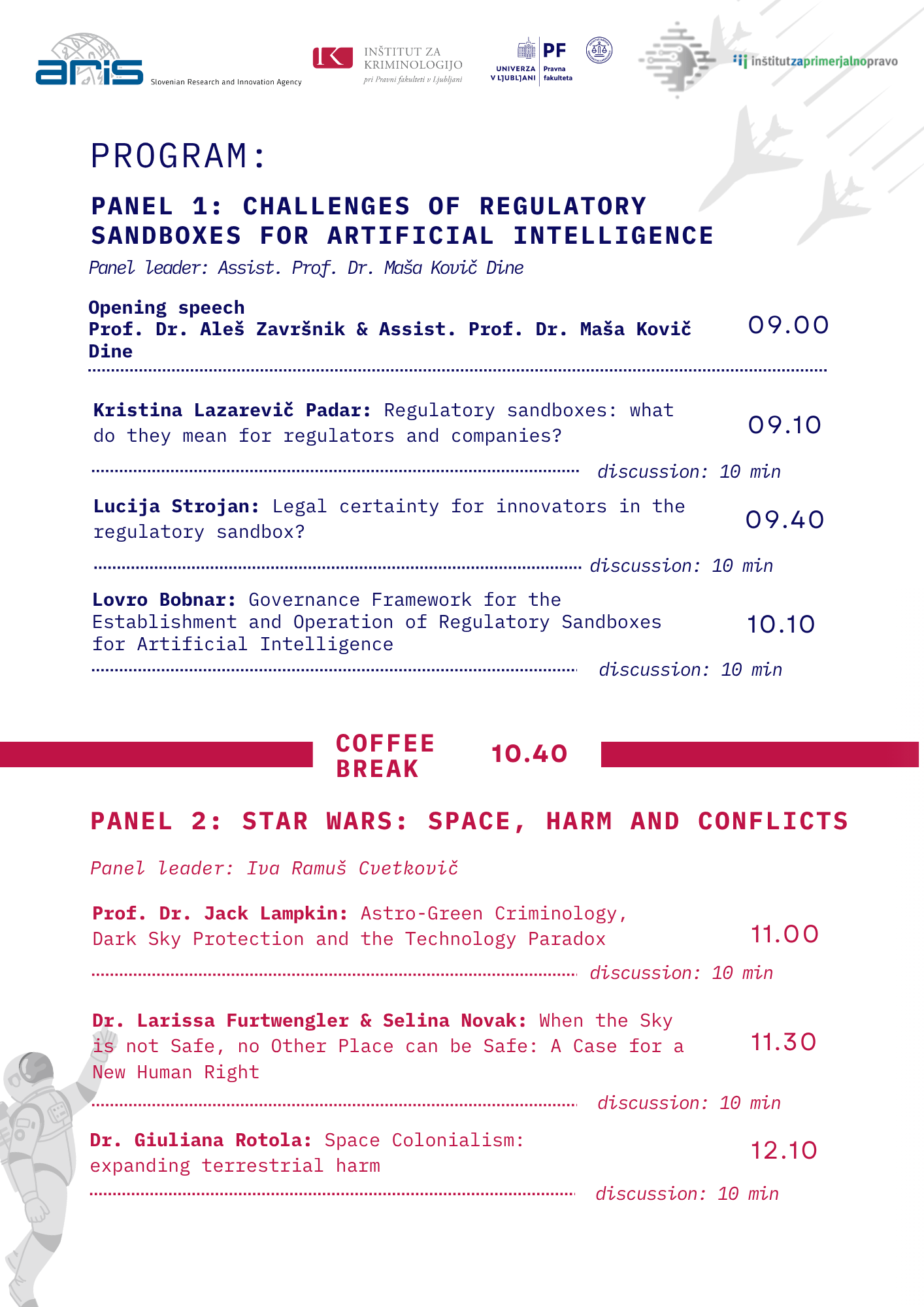 Program bo pokrival teme: pravo in umetna inteligenca, vesolje in vesoljski odpadki, tehnologija in etika ter nove oblike (ne)vidnega nadzora.